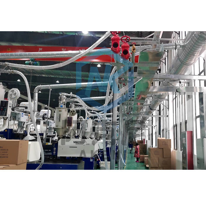 中·央供料系統(tǒng)、集中供料系統(tǒng)、統(tǒng)一供料系統(tǒng)實現原料集中處理、封閉輸送、徹底避免車間噪音、灰塵、熱氣污染。解決原料重復人工搬運的高成本及因疏忽而產生干燥不徹底的缺料問題,更不會混入不被允許的其它材料,更重要的是減少采購、耗電、維修成本,提高產品質量,提高工作效率。體現在